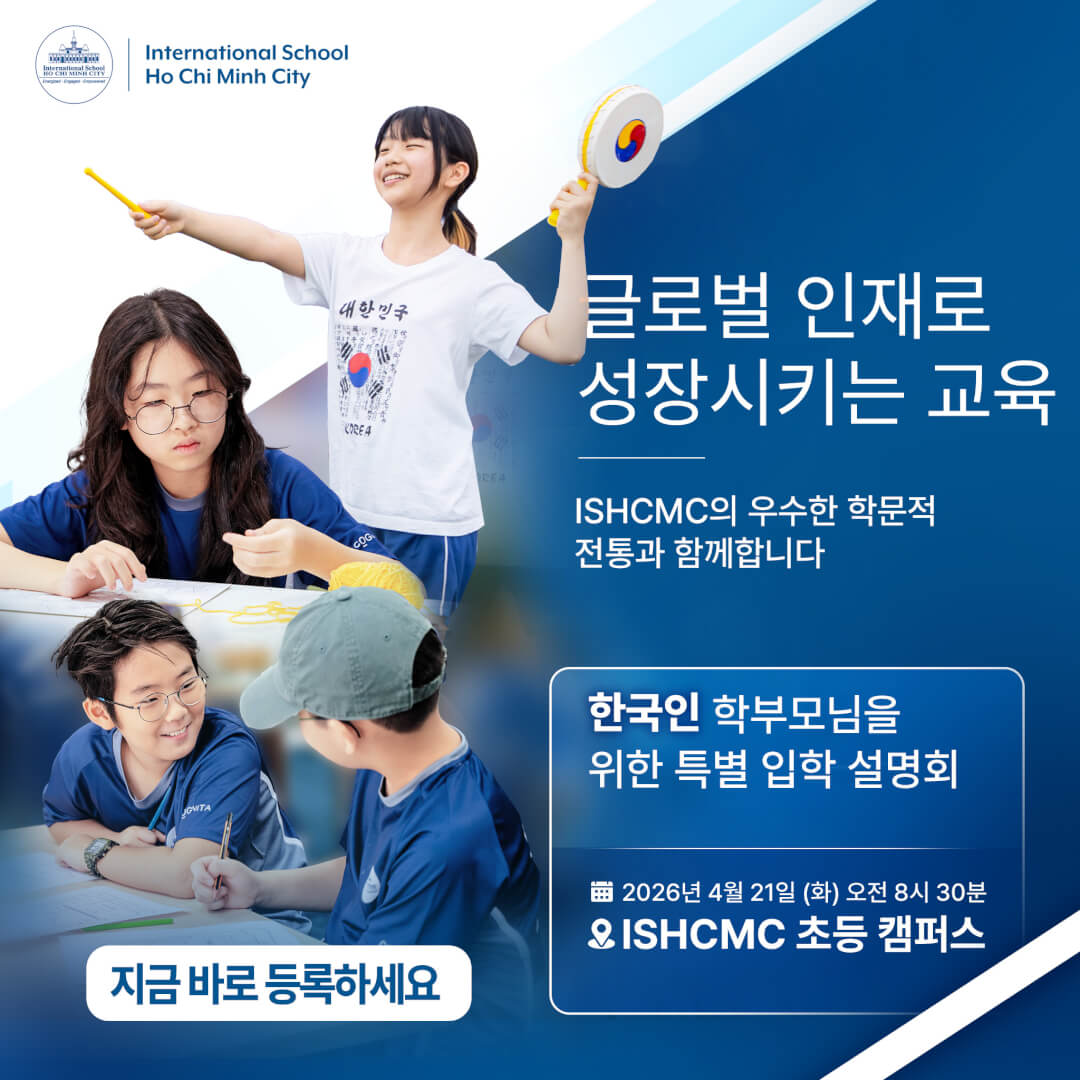 호치민시 국제학교(ISHCMC)에 관심을 가져주신 것에 깊이 감사드립니다. 자녀에게 가장 적합한 학교를 선택하는 일은 매우 중요한 결정이며, 학부모님들께서 ISHCMC를 고려해 주시는 것에 큰 기쁨을 느끼고 있습니다.